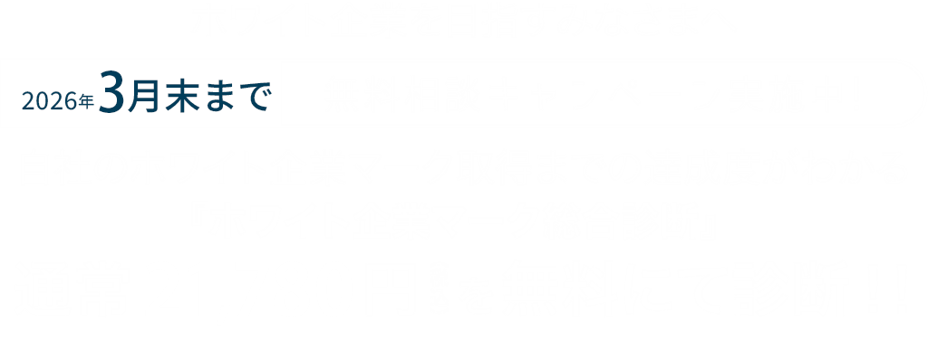 そこで、SHEMでは始めに『ホワイト企業マーク総合診断』を行い、あなたの会社がホワイトマークの取得が可能かどうかを判断しております。
